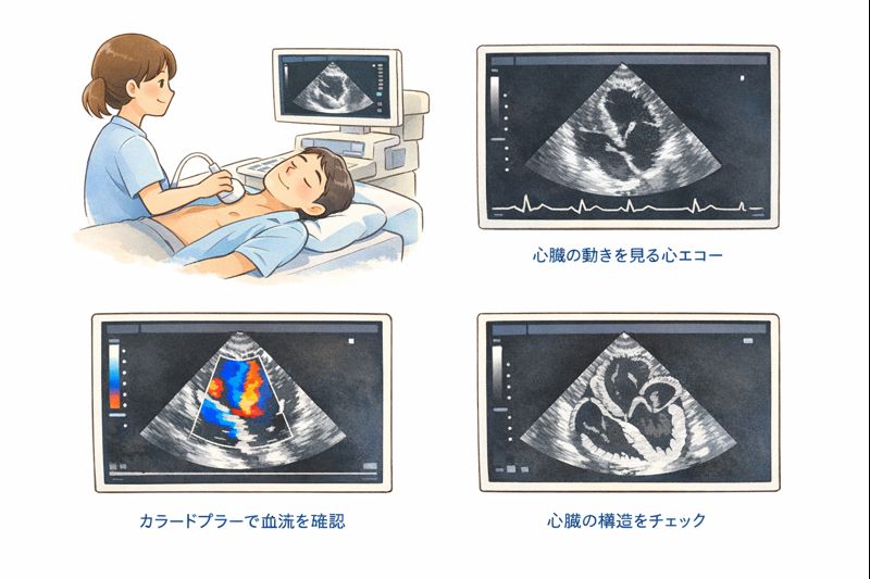 心臓エコー(心エコー)は、超音波を使って心臓の形や動きを直接観察する検査です。