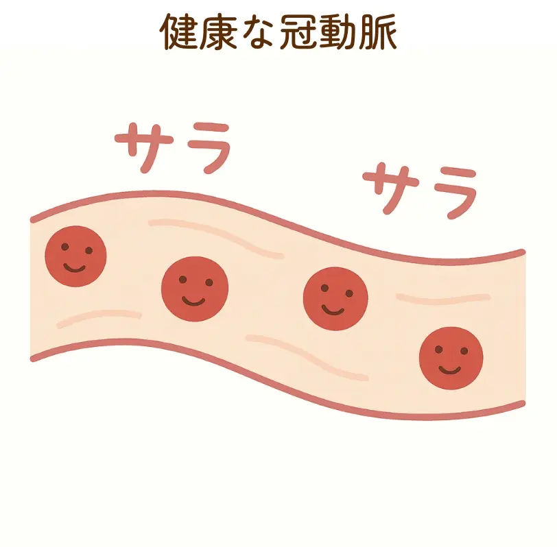 高血圧、糖尿病、高脂血症、喫煙、年齢、遺伝などの要素で動脈硬化が進み、冠動脈の内腔が狭くなり、血流が悪くなるため狭心症が起きる