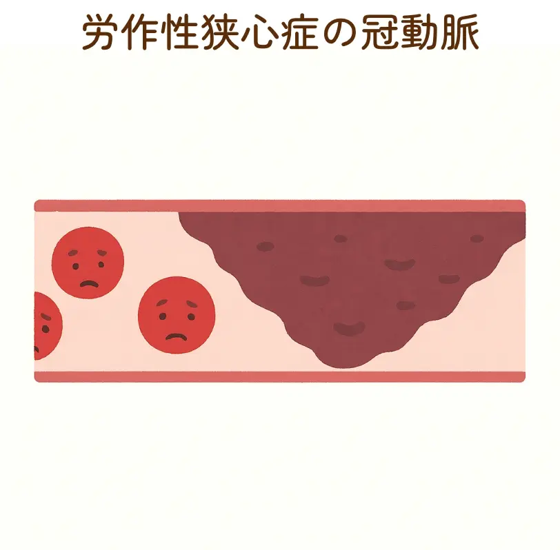 そもそも狭心症とは心臓に酸素や血液を運ぶ役割をしている、冠動脈という血管が動脈硬化により内腔が狭くなり、心臓へと酸素や血液を充分に送れなくなることで胸痛が生じる病気です。特に階段を登る、家事など(労作)で心臓に負担がかかった時に起きるのが労作性狭心症です。労作ではなく朝方やストレス時、安静時に起きやすいのは冠攣縮性狭心症の可能性があります。