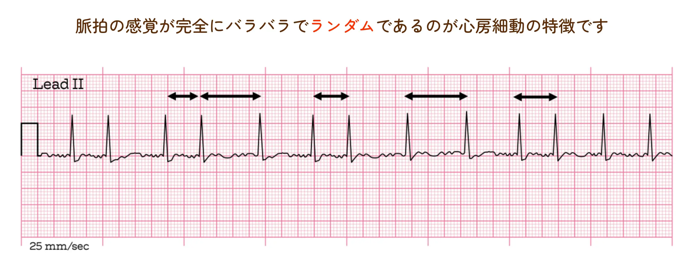 この不整脈の特徴は「脈拍がバラバラ」というものです。不整脈なので、脈がバラバラなのは当然ではないかと思われるかもしれませんが、心房細動は「脈が完全にランダムに打つ」というのが大きな特徴の不整脈です。