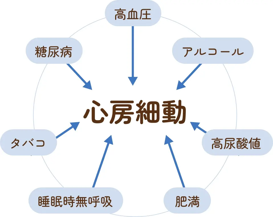 原因は多くありますが、簡単に申し上げると、「心臓へのストレス」が積み重なると、心房細動を発症しやすくなります。では何が心臓へのストレスとなるかというとわかっているものとして