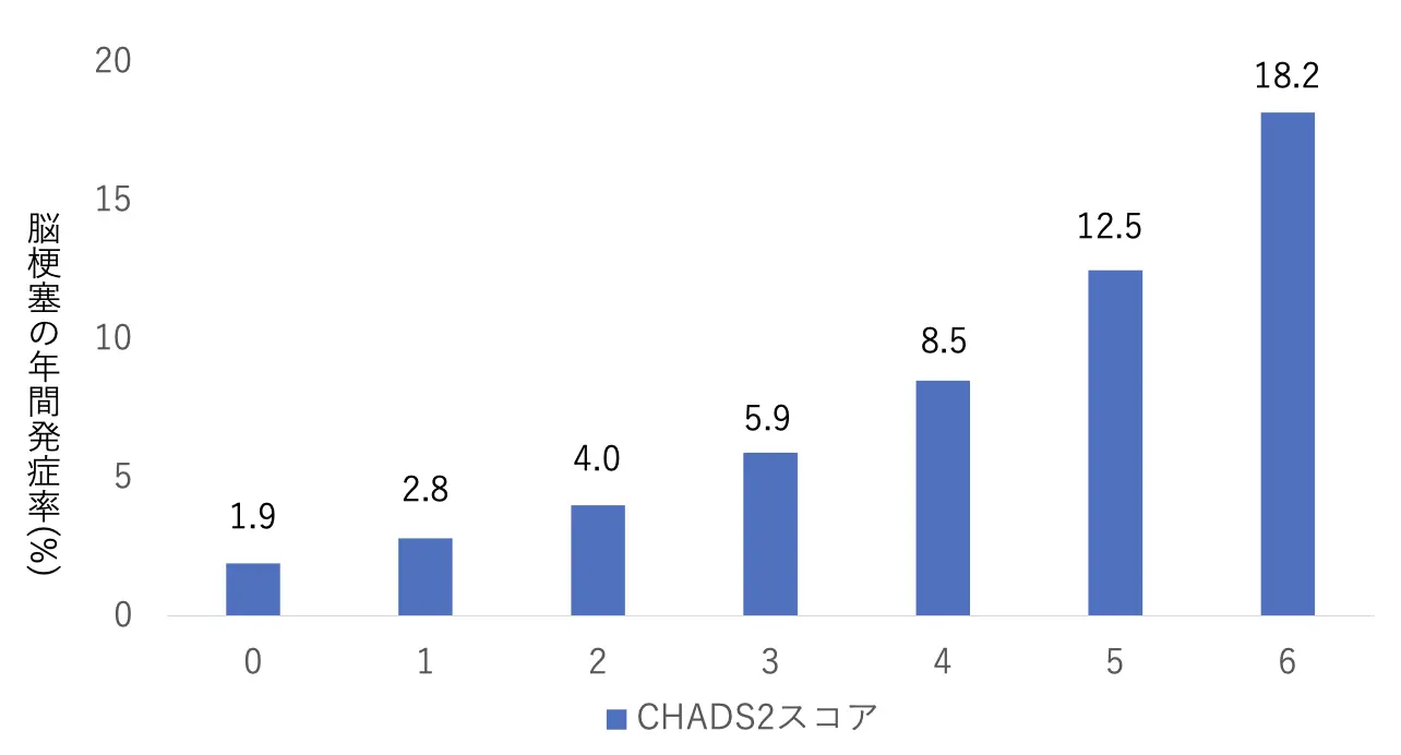 CHADS2スコアが1点以上あると、抗凝固薬を内服することによる脳梗塞のメリットが、出血しやすくなるというデメリットを上回るといるため、内服をおすすめしています。